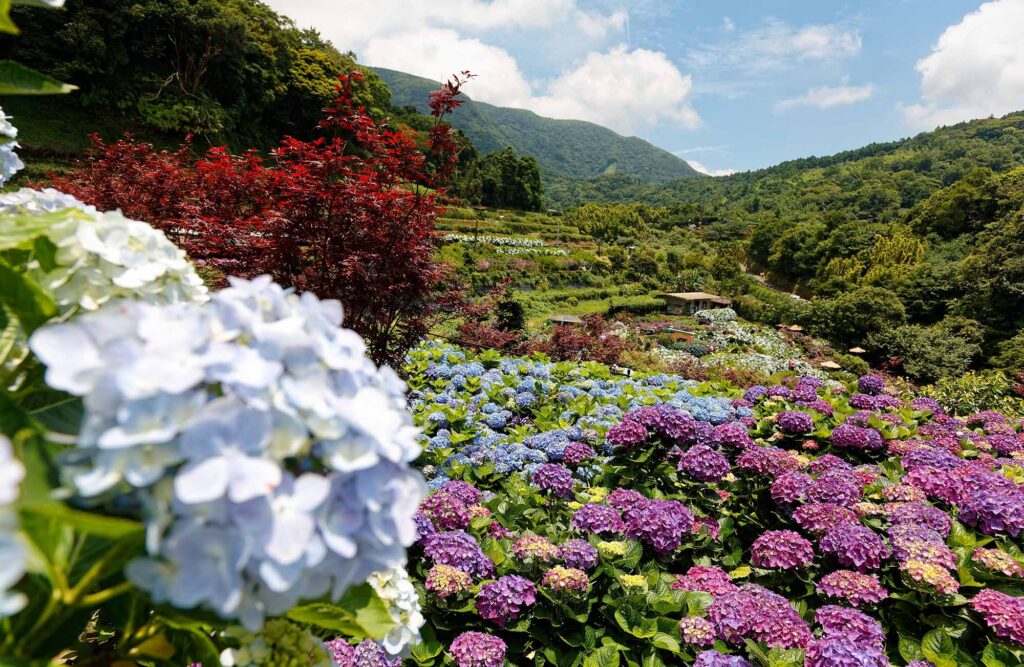 After the heat and hiss of Xiaoyoukeng, the road curves down to Zhuzihu, a tranquil valley surrounded by bamboo groves. Farmers here cultivate seasonal flowers that turn the landscape into a painter’s palette. In spring, white calla lilies bloom in neat rows, creating a sea of blossoms. Early summer brings hydrangeas in shades of purple and blue. Even outside flower season, the terraced fields and cool mountain air are worth the visit.